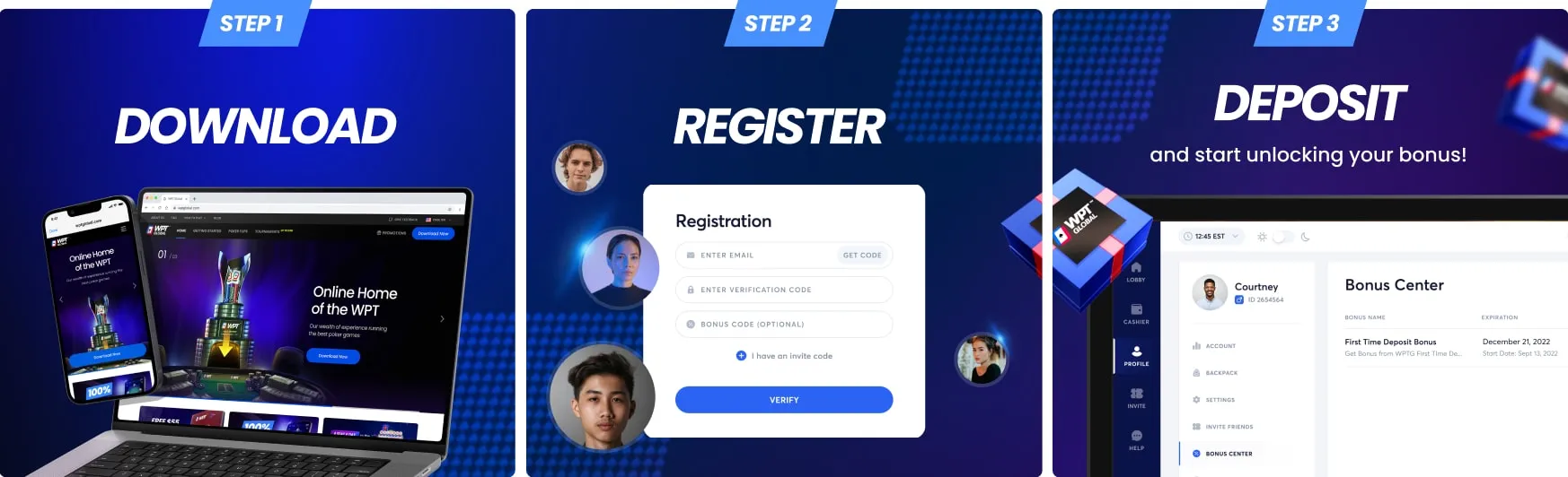 Create an account to join the WPT Global poker community. Choose your poker nickname, fill in a few details and verify your email, then you’re all set. Download poker to your PC, Mac, mobile or tablet and start playing the games you love in minutes.