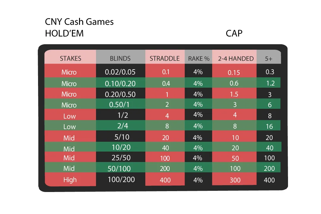 Regular cash games are played from ¥0.1/0.2/0.4 ($0.01/$0.02/$0.06) up to ¥100/200/400(100) ($15/$30$60($15)), and for 6+ Hold’em up to 500 Suede CNY ($78).